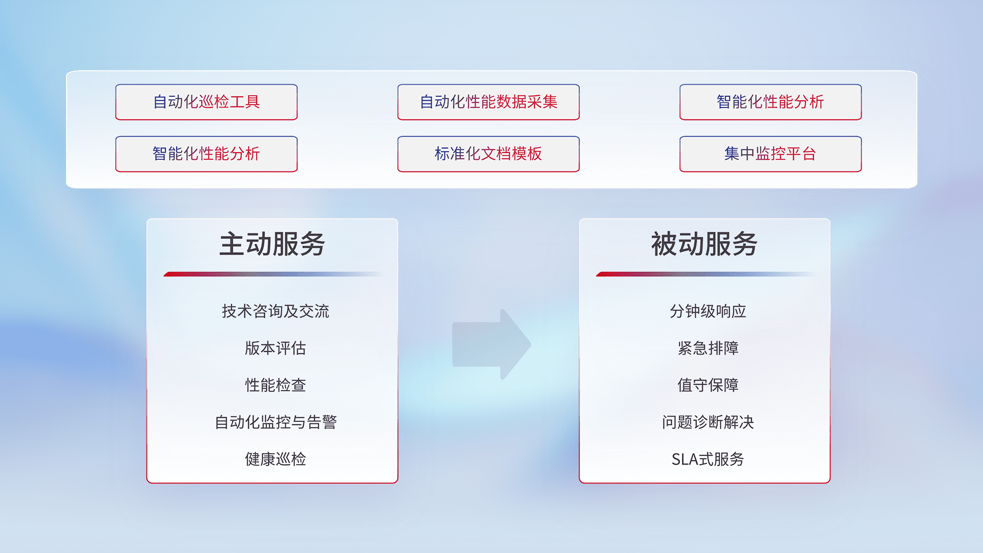 智能化工具和标准化文档,,,保障服务质量,,,,提供主动服务(包含技术咨询、、版本评估、、性能检查、、、自动化监控与告警、、健康巡检)和被动服务包含(分钟级响应、、、、紧急排障、、、、值守保障、、、问题诊断解决、、、、SLA服务)。。。