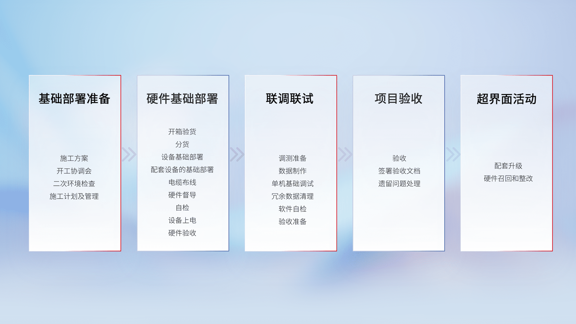 从基础部署准备、、、硬件基础部署、、、联调联试、、项目验收、、越界面活动的全过程可追溯,,,,保证施工质量和进度。。。。